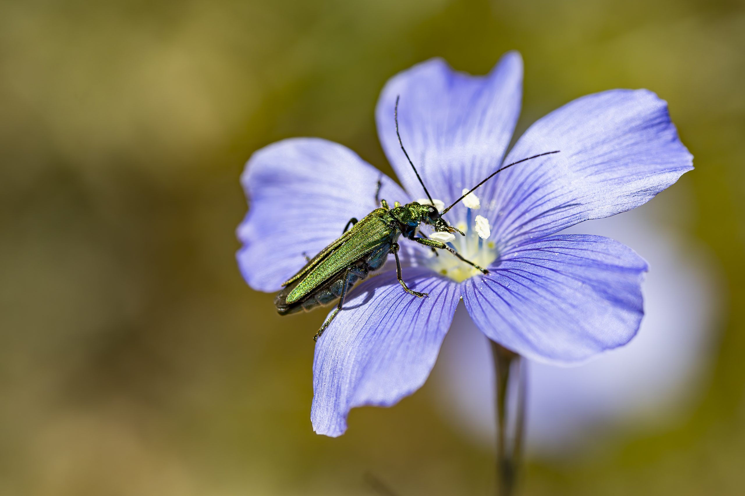 Esta vistosa hembra de escarabajo (Oedemera) destaca con su coloración verde metálica con destellos dorados, mientras se alimenta de polen. La flor de lino azul es muy apreciada por una gran variedad de insectos, que acuden a desayunar desde primera hora de la mañana: abejas, sírfidos, chinches, pulgones, escarabajos…