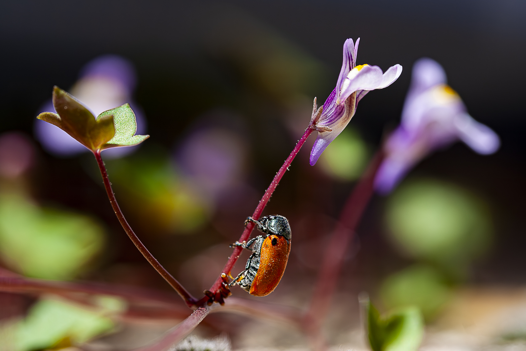 Una pequeña hembra de escarabajo (Labidostomis lusitanica) eligió una de las flores para realizar su puesta de huevos a mediados de abril. Para fijarlos al tallo, las hembras excretan una pasta pegajosa al mismo tiempo que los huevos, que se endurece al contacto con el aire.