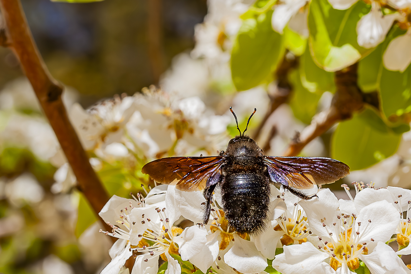 El abejorro carpintero (Xylocopa violacea) no impresiona solo por su tamaño, sino por su sonoro zumbido. Es el más grande del oeste europeo y llega a medir hasta 3 cm. Está cubierto de un denso pelaje azul oscuro, en el que quedan pegados gran cantidad de granos de polen en su continuo ir y venir de flor en flor.
