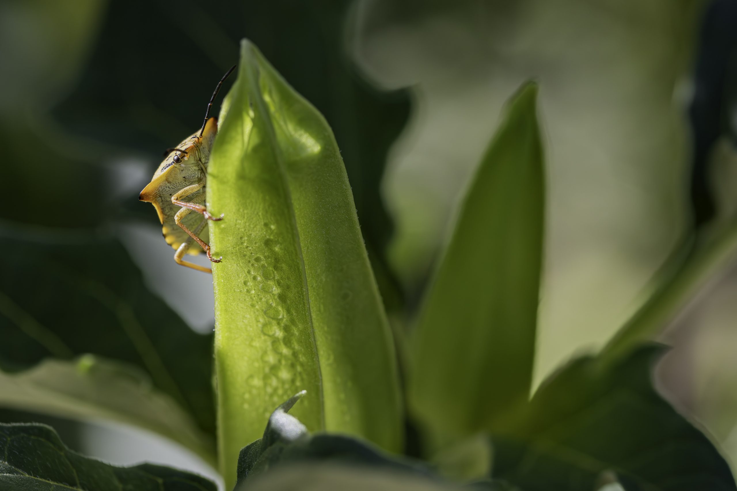 Esta chinche del género Carpocoris pasó largo rato abrazada a este capullo aún sin abrir, alimentándose de tanto en tanto del néctar que escondía en su interior. Para acceder a los dulces jugos vegetales, las chinches clavan su afilado aparato bucal, a modo de estilete, para absorber el líquido como si de una pajita se tratase.